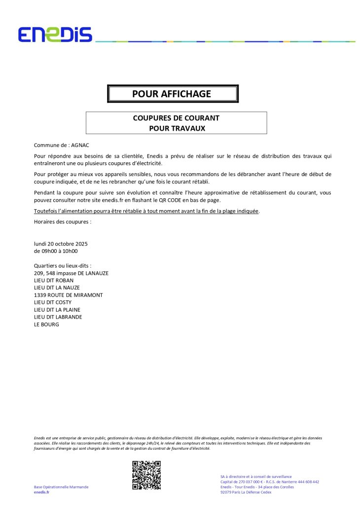 COUPURE ELECTRICITE MERCREDI 10 SEPTEMBRE 2025